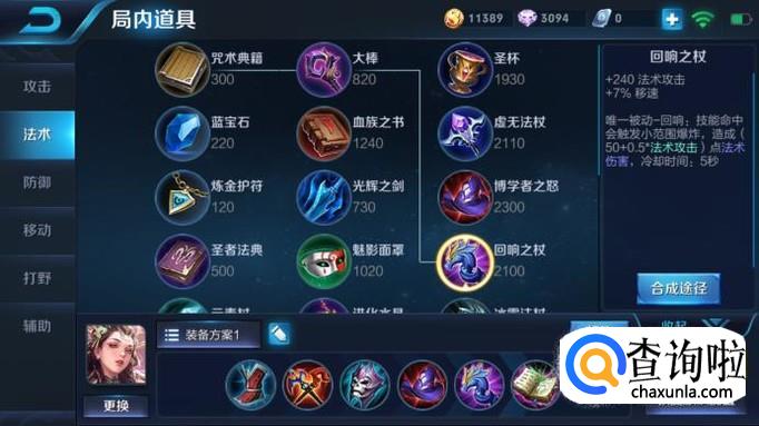 接着出回响之杖,其增加的240点法强和被动爆炸的特点可以弥补杨玉环技能伤害,贤者之书作为一件最大件,不但会大幅增加杨玉环的法强,还能增加生命值,避免其被刺客秒杀。
