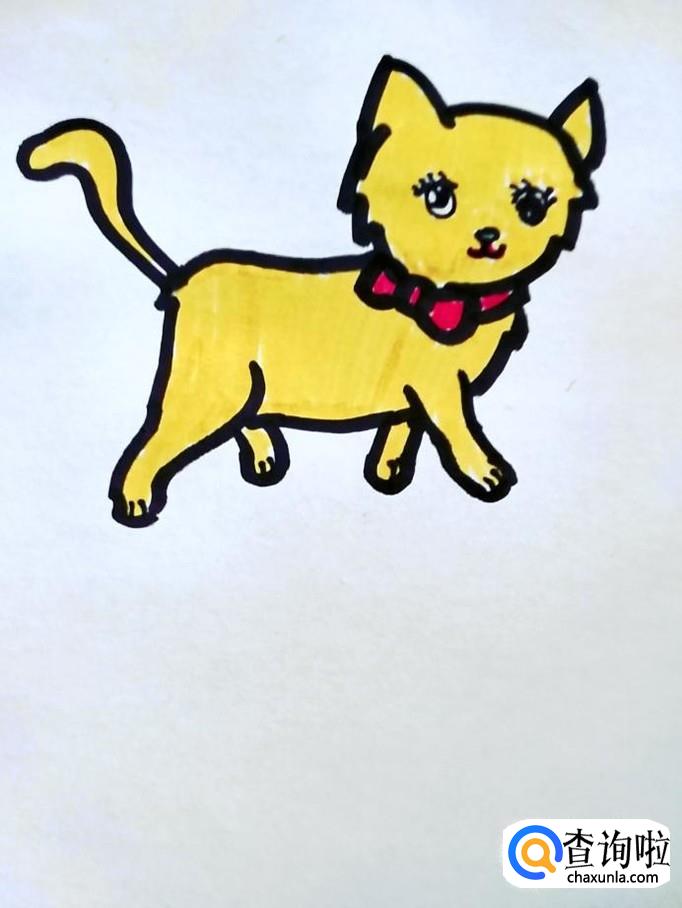 如果喜欢的话可以给猫咪涂上喜爱的颜色,我们这里涂得姜黄色的猫咪,红色的领结如图所示,那么小猫咪的简笔画就画完了!
