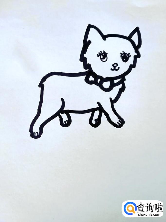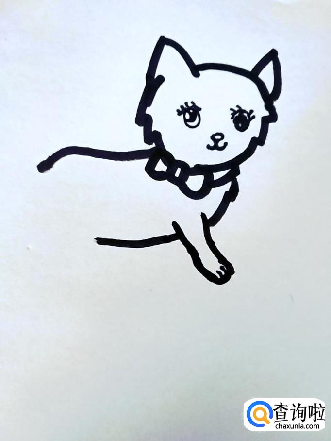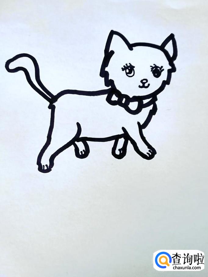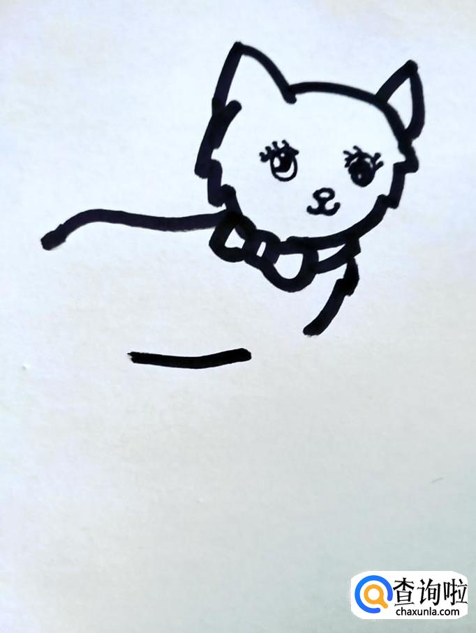 在猫咪的头部下面的脖颈位置画出一个带蝴蝶结的领圈。领圈左半部分都是蝴蝶结的空间,领圈右半部分斜向上收到下巴下面。