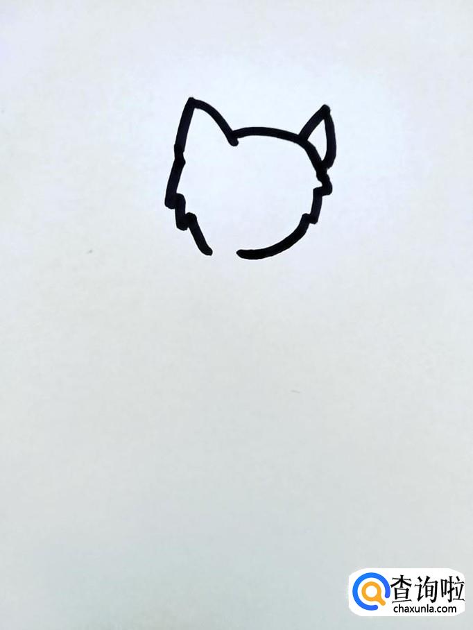 用白板笔画出猫咪的头,猫咪的头是侧着的,所以画的头部轮廓跟着偏转一些。由于眼睛特殊的视觉效果,所以我们把在外侧的左面画的稍微大些,在内侧的右面稍微小些。