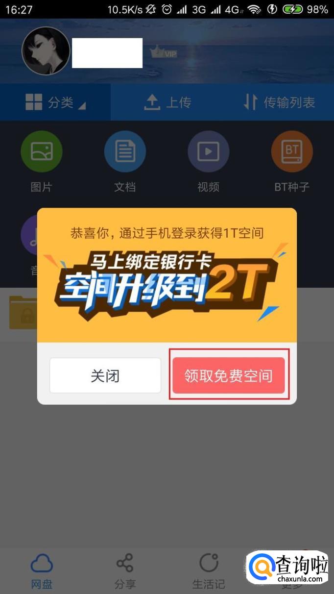 进入网盘主页面之后,应用将自动弹出扩容的通知,点击“领取免费空间”按钮。