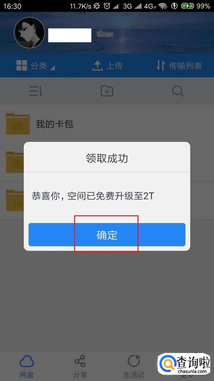 绑卡完毕之后,应用会弹出信息提示,提示我们当前网盘的容量已经被免费扩容至2T。