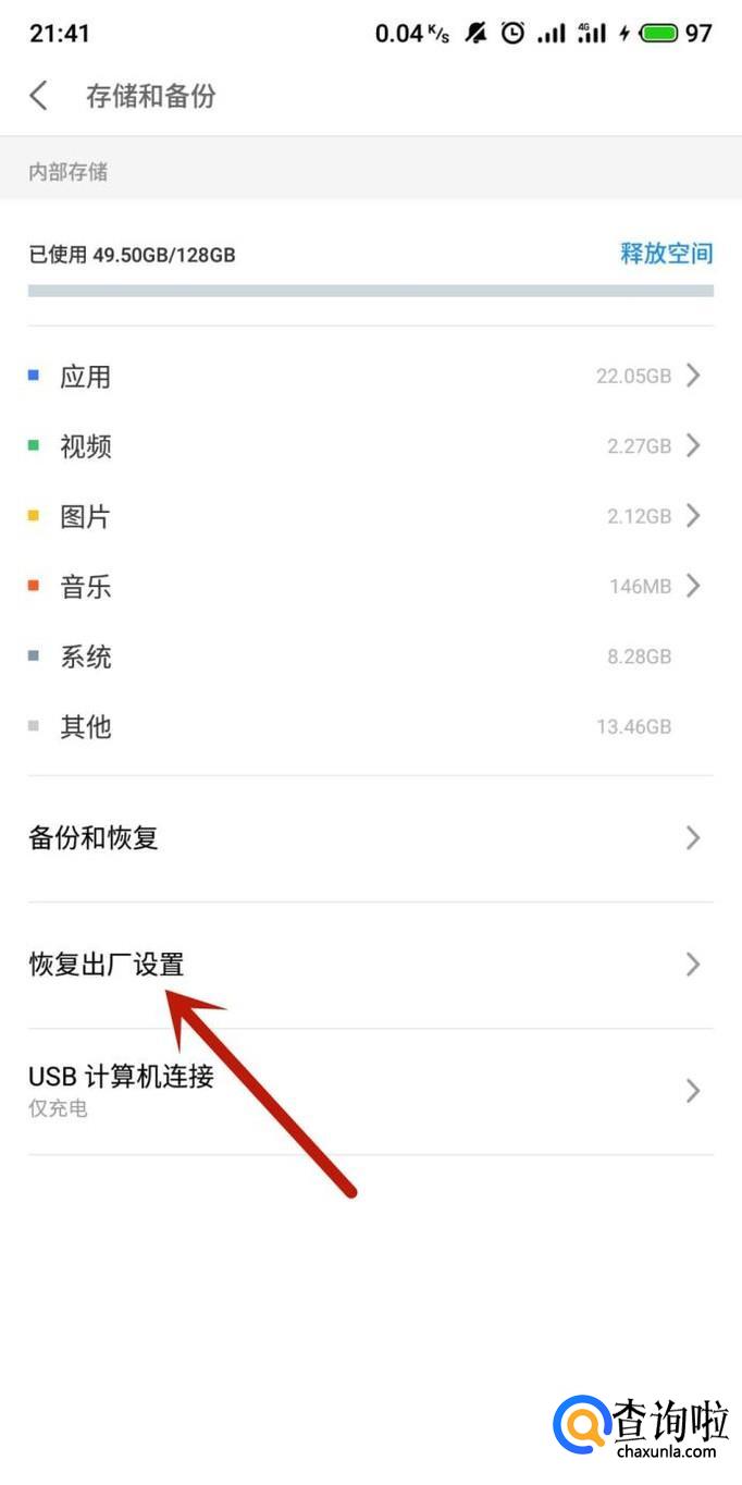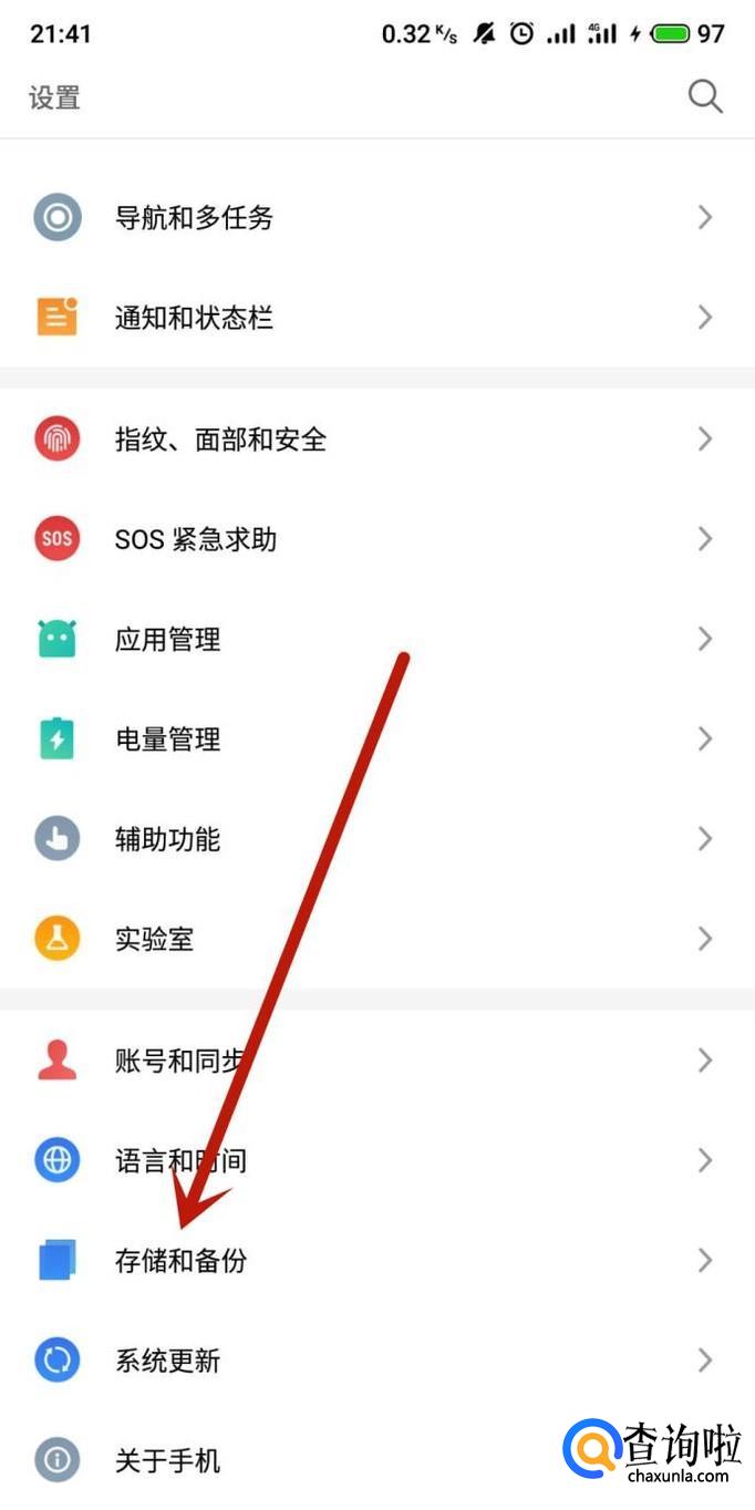 进入手机设置,选择“存储和备份”,如图所示。