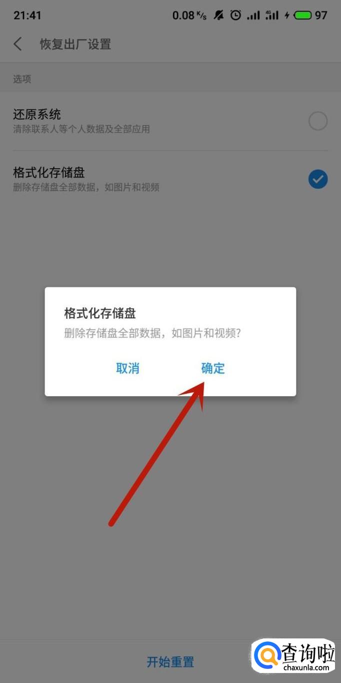 在出现的弹框内点击“确定”将手机进行重置,重启手机即可。