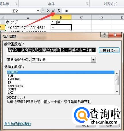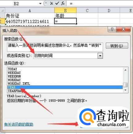 再点击编辑栏的插入函数按钮,弹出插入函数对话框,在类别处选择日期与时间类,在列表框中选择YEAR函数,按确定。