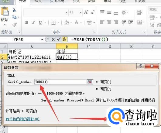 确定后弹出函数参数的对话框,在Serial_number参数后面的文本框中输入Today()函数,按确定计算出本年。