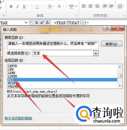 在对话框中选择类别为文本,再于列表中选择MID函数,按确定。