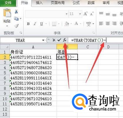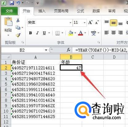 这样就计算出了年龄了,MID函数是用来获取身份证号中的年份,再用今年减去身份证号中的年份就得出年龄。再把该单元格公式向下填充就计算出所有身份证号的年龄了。