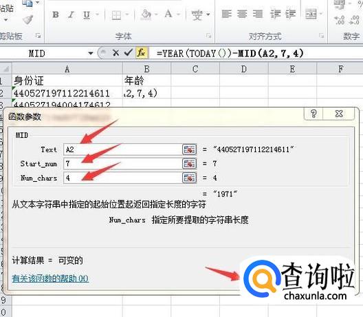 在Text参数中选择身份证号所在的单元格,在Start_num参数中输入7,在Num_chars参数中输入4,按确定。