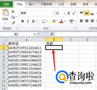 首先,打开Excel2010,在表格中录入好包含身份证号码的数据表,接下来点击要放置年龄的单元格。
