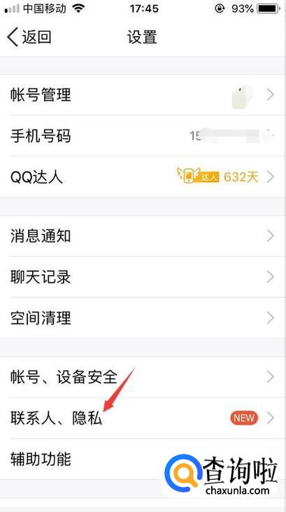 然后在设置功能里面找到联系人、隐私并点击打开。