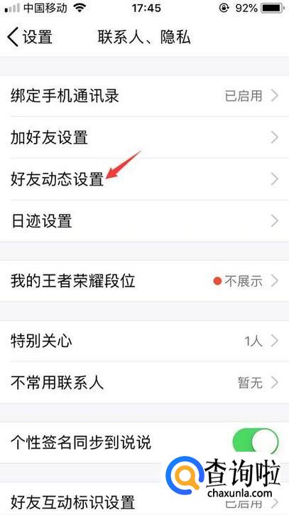 打开联系人、隐私后会看到有一个好友动态权限的设置入口,我们点击一下。
