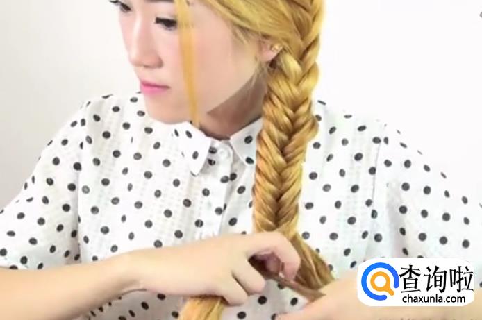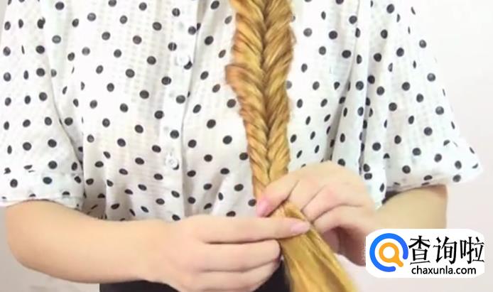 又从另一侧拿起一股头发交叉又合成一股,反复下去,直到到了颈部为止。