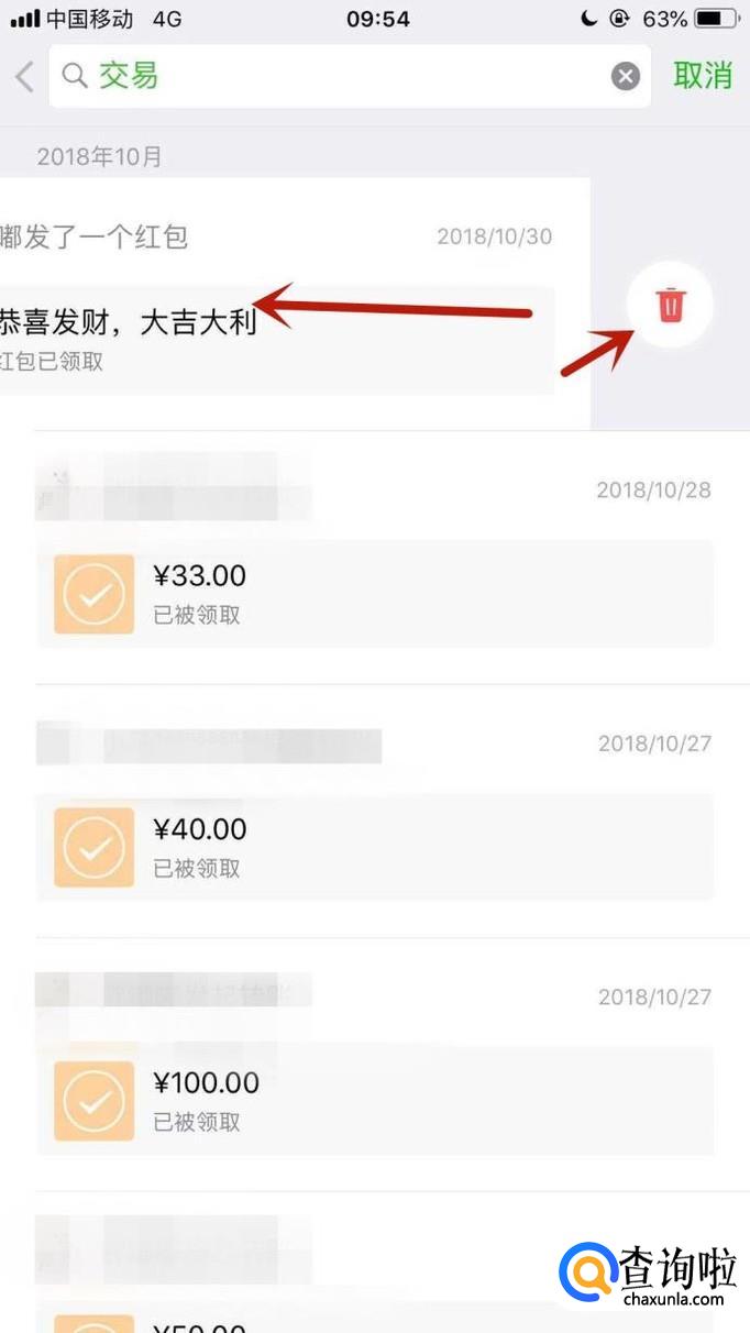 最后将要删除的红包记录完左滑动,并点击垃圾箱图标就可以了。