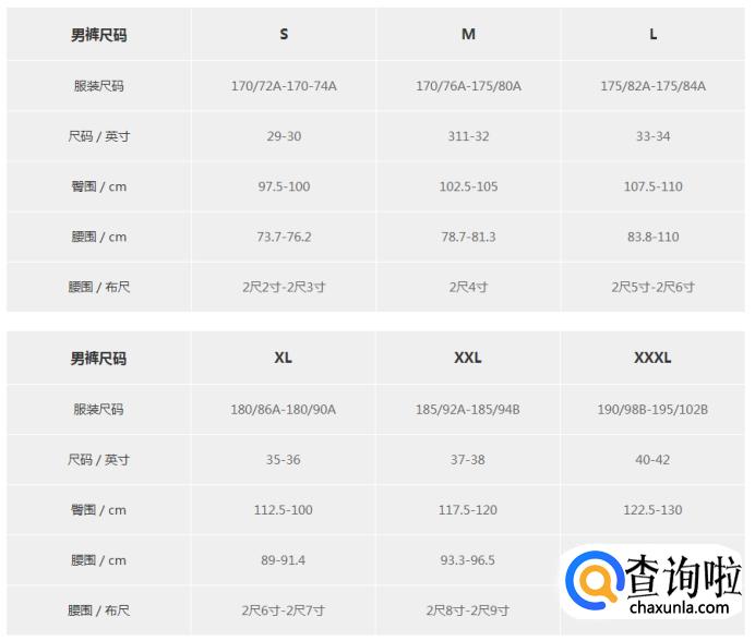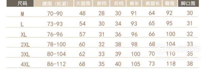 休闲裤型号对照表;
