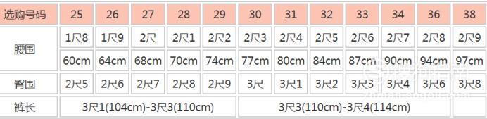 牛仔裤型号对照表