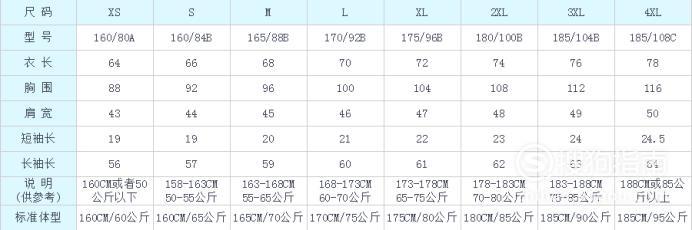 翻领/圆领T恤衫型号对照表;