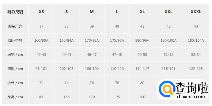 男士衬衫型号对照表;