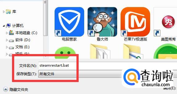 然后点击“文件”-“另存为”文件名“steamrestart.bat”,然后文件类型选择所有文件。