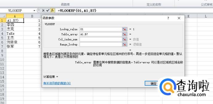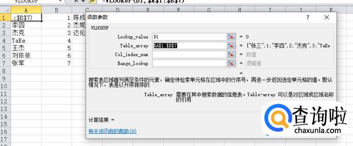 并且在下方函数——Table-array格中选中A1:B7(要引用的范围)。