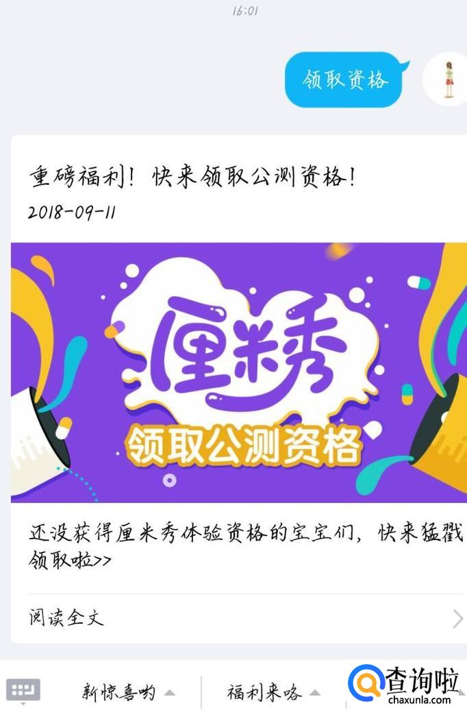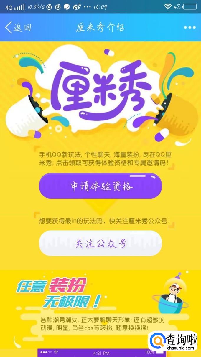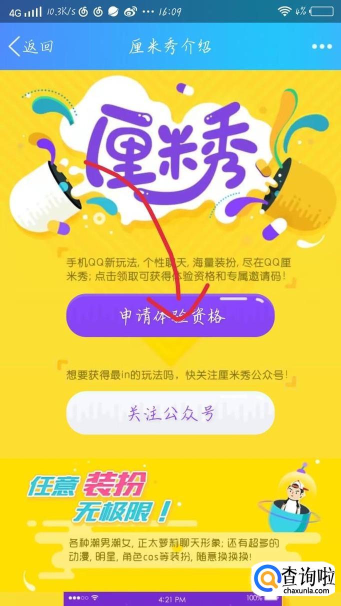点击“申请体验资格”如图1箭头所示。向下滑动手机,点击“开启厘米秀”如图2箭头所示。