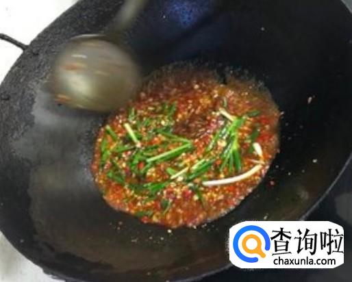 起锅烧油,然后将葱姜蒜小米辣倒入油锅进行爆炒,如图所示。