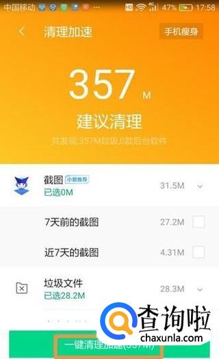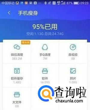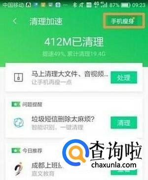 清理完成后可以进行进一步的加速,点击屏幕右上角的“手机瘦身”,对占用手机内存的无用内容进行清理。
