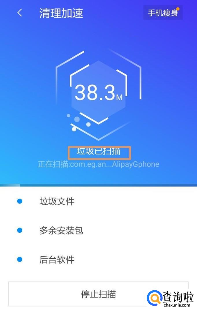 然后软件就会自动对手机内产生的垃圾文件进行扫描。