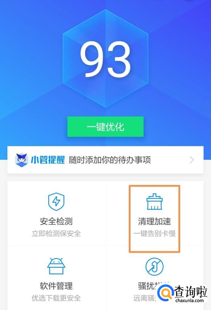 首先我们需要在手机上下载一个手机管家APP,打开以后在首页点击“清理加速”。
