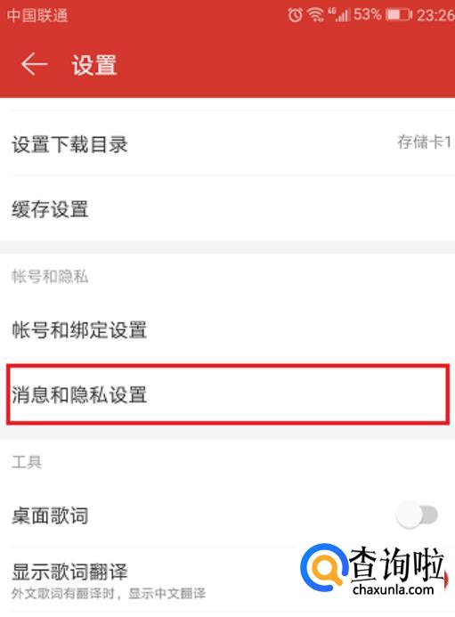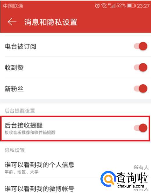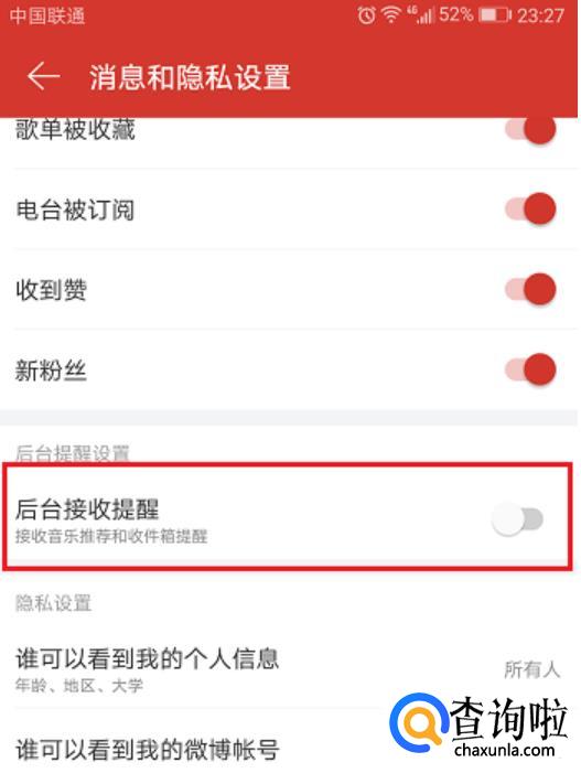 进去音乐设置界面,点击消息和隐私设置。进入消息和隐私设置之后,可以看到默认是后台接收提醒的,点击关闭。