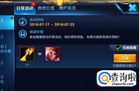 通过孙策的钥匙即可免费兑换英雄孙策,如图所示。