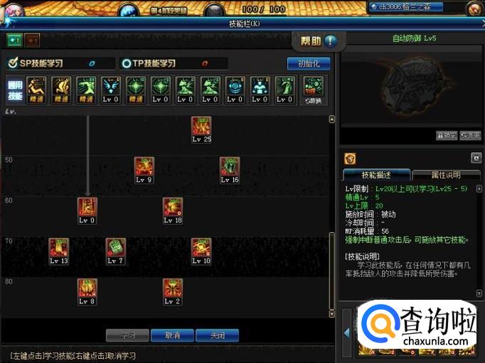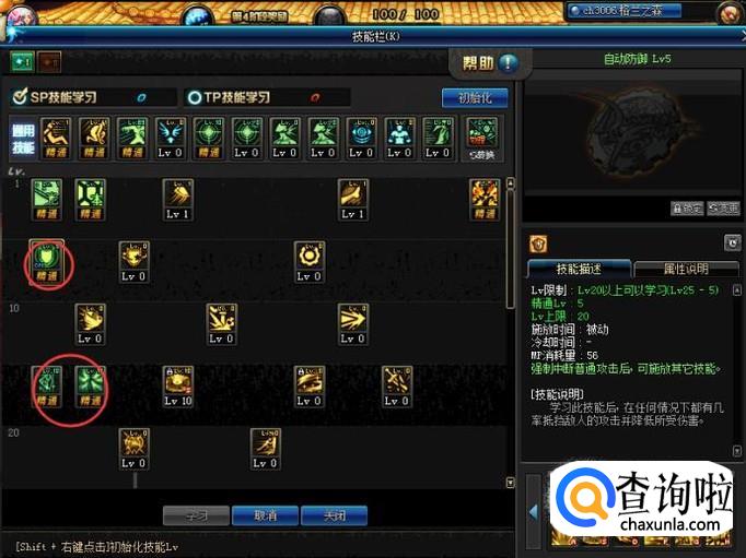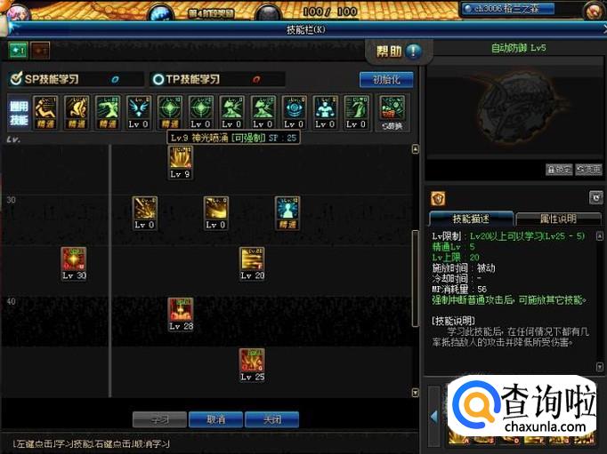 然后我们打开技能栏,先将最上方的通用技能受身蹲伏和物理暴击加满。然后我们选择将天使光翼,天使降临,自动防御加满,神光冲击先学一级最后将剩下的SP点再加给它。
