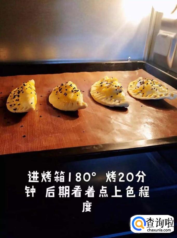 然后在烤盘上刷上一层油水,之后把苹果派放进烤箱180°火烤20分钟,如下图所示。