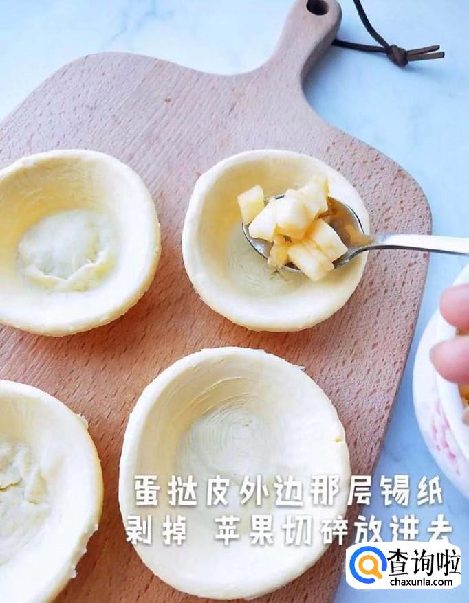 首先将蛋挞皮外的那一层锡纸剥掉,苹果切碎放进去,如下图所示。