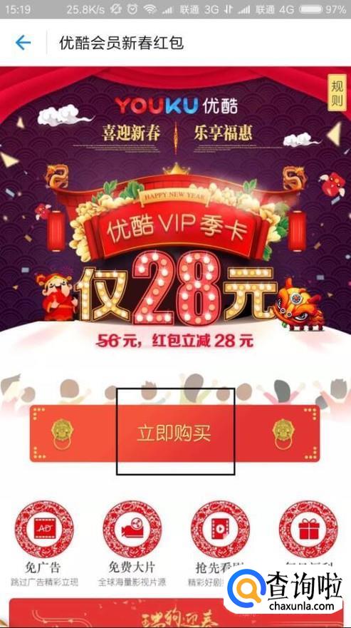 点击对应的任务宝箱之后,即可进入支付宝优酷会员充值页面,点击“立即购买”按钮即可。