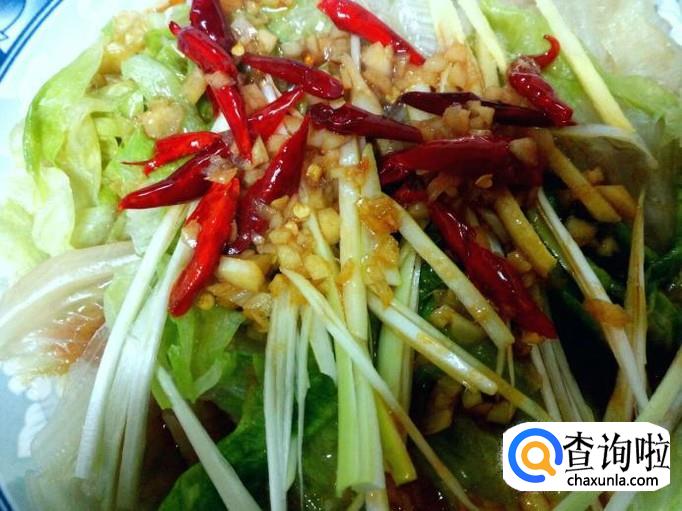 红干椒略翻炒一下,放入调和好的料汁烧开,然后关火。把烧好的料汁浇在盘中的西生菜上即可。