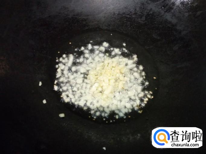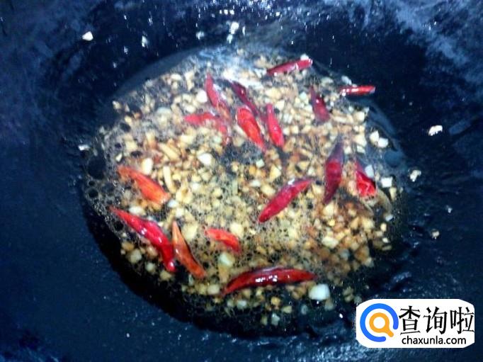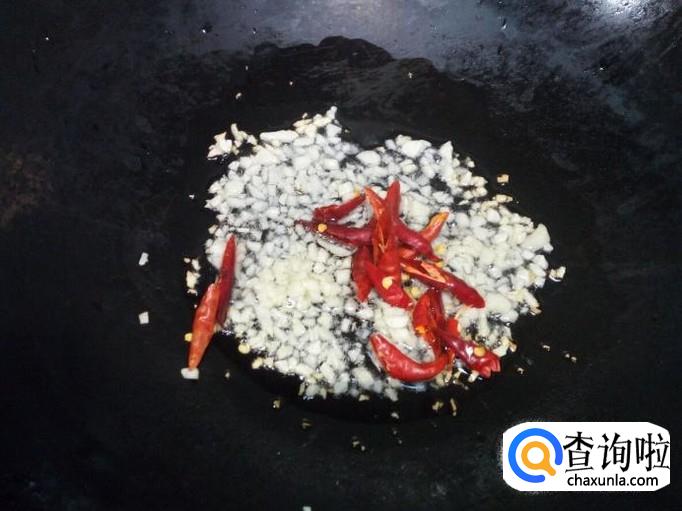 锅里放入油加热,油热后放入蒜末小火翻炒,炒至蒜末出香味后,放入红干椒翻炒。