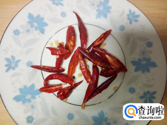 红干椒用水清洗干净,控干水分,斜刀切成段。