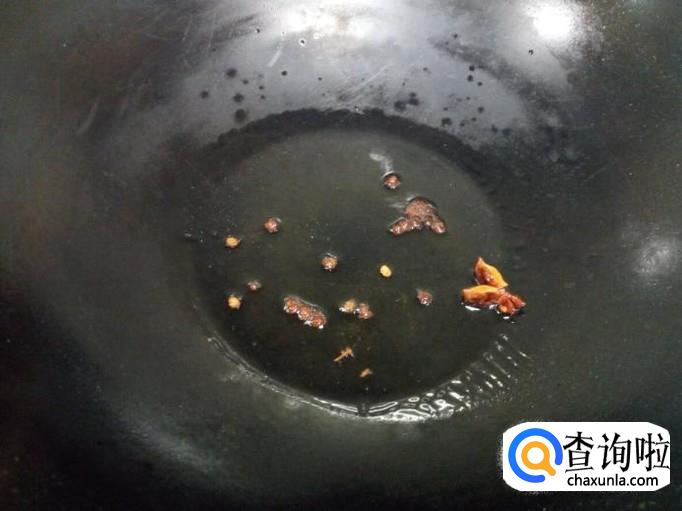 锅里放入油加热,油热后放入花椒,八角爆锅。随即放入鸡腿翻炒。
