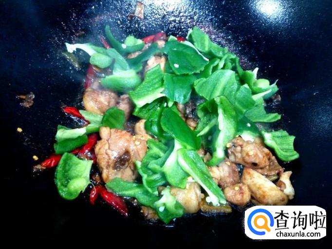 红干椒略翻炒一下,放入青椒翻炒。炒至青椒断生,放入味精,关火出勺。