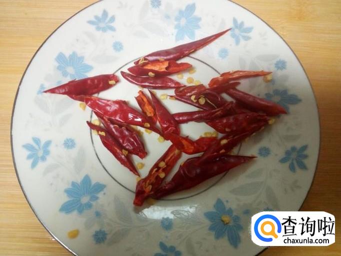 红干椒用水清洗干净,控干水分,斜刀切成段。切好葱,姜备用。