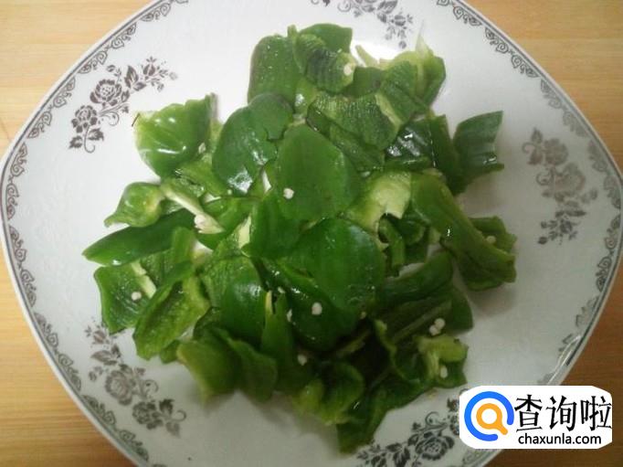 青椒用水清洗干净,控干水分,用手撕成片。
