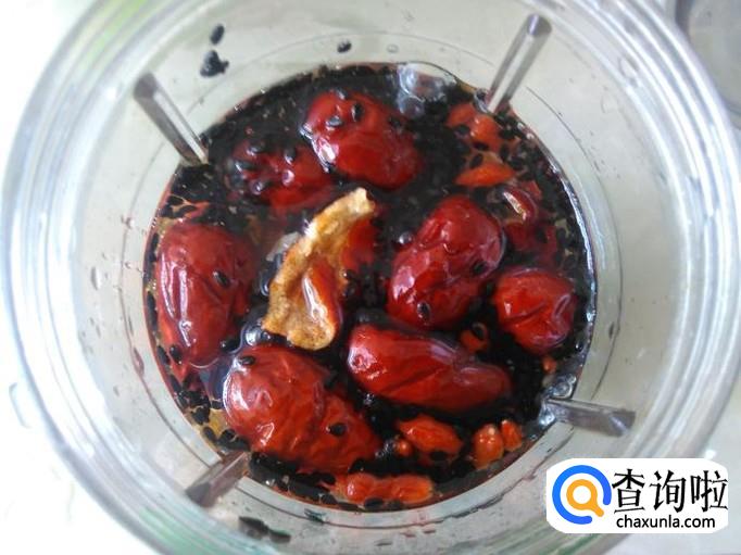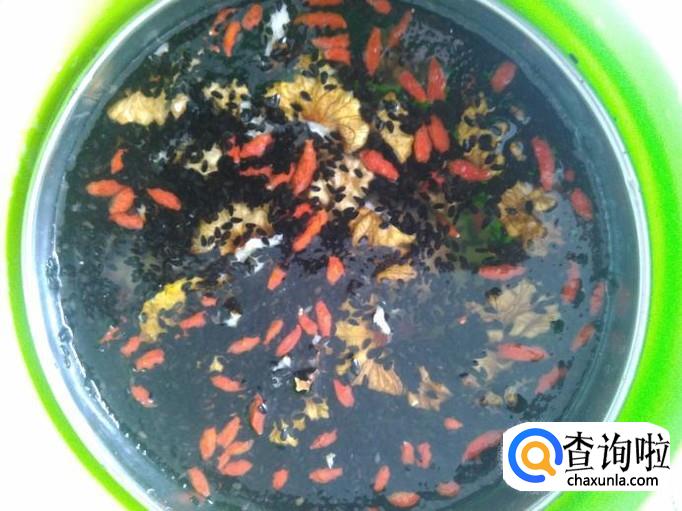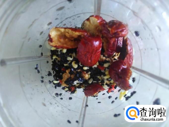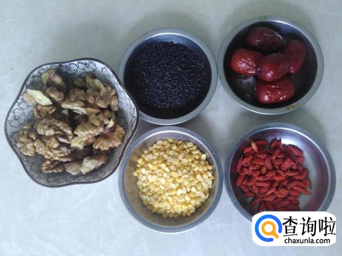 核桃50克,芝麻30克,去壳的绿豆30克,枸杞20克,红枣20克,鲜奶1杯,白糖适量。