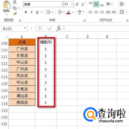 以B列为辅助列,在B110:B118这区域单元格内同时填充上一个“1"