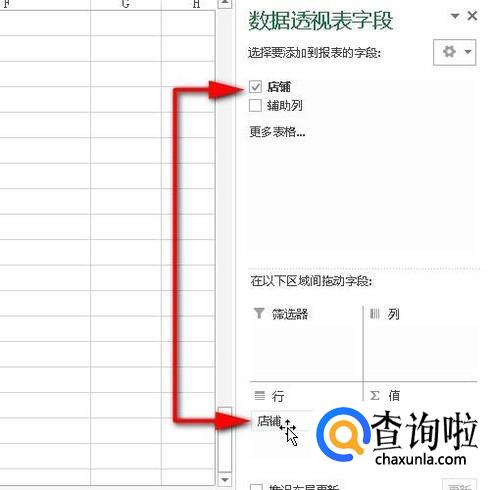 在工作表右侧这里弹出数据透视表字段。把店铺字段拉到行这里,如图所示。