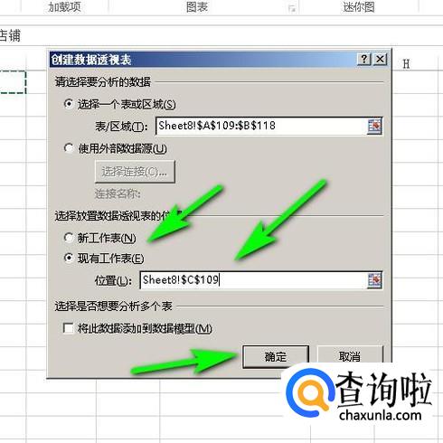 弹出数据透视表面板,设置透视数据表位置为C109单元格;再点确定。