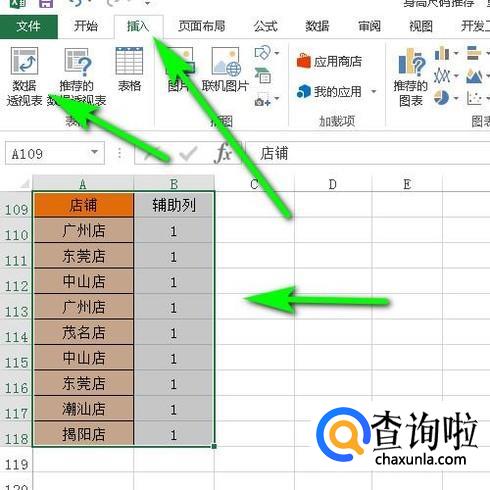 选中A109:B118;再点击插入选项卡,再点:数据透视表
