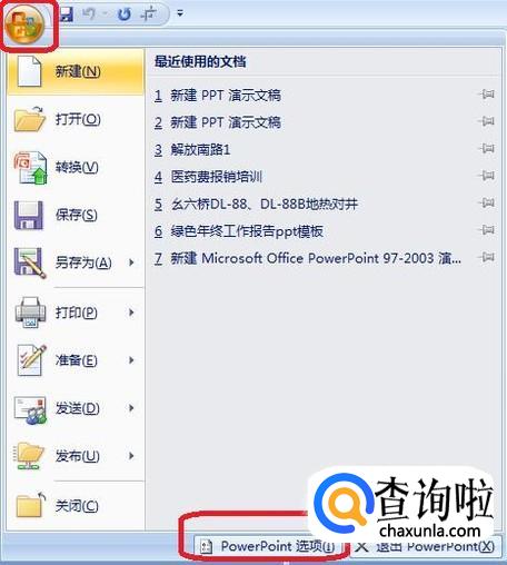如图所示,点击文档左上角的“OFFICE按钮”,弹出菜单,我们选择“PPT选项”。