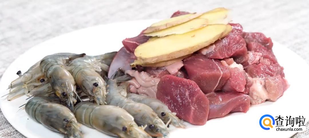将羊肉切大块;剪去虾枪和虾须;姜切片。