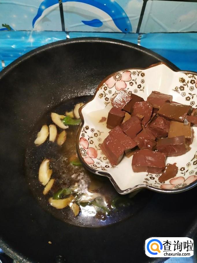 准备一块新鲜的鸭血,取出适量,切成块,放入盘中备用。小贴士:可以将鸭血倒扣在盘中,再切块。